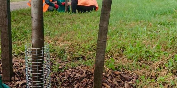 Зеленбудівці встановили 32 захисні металеві сітки на стовбури дерев вздовж Столичного шосе.